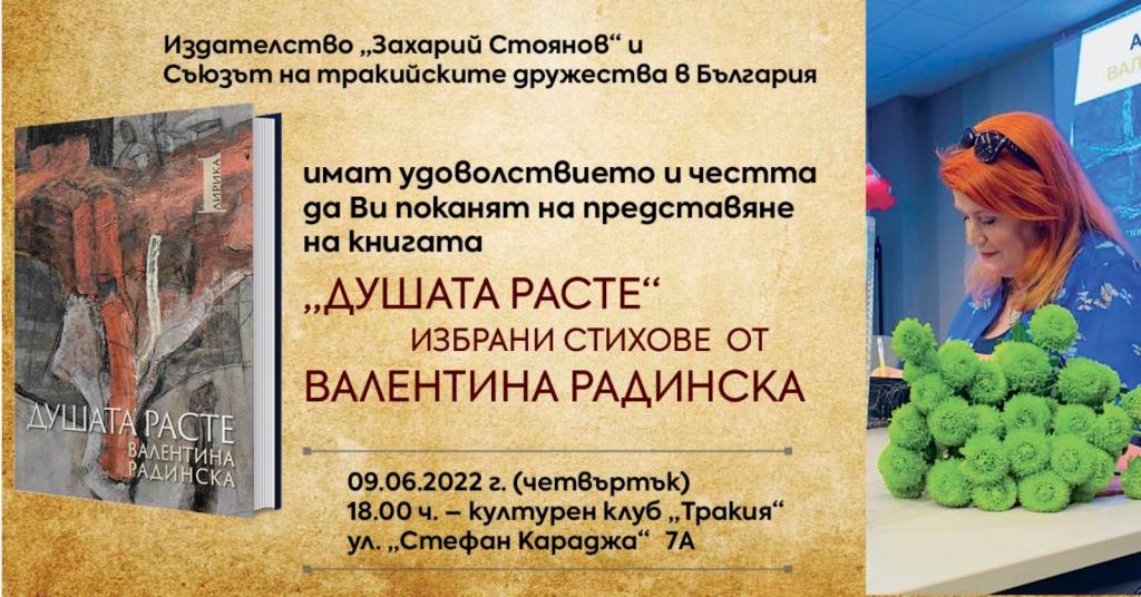 „ДУШАТА РАСТЕ“ – нов том с избрани стихове на ВАЛЕНТИНА РАДИНСКА